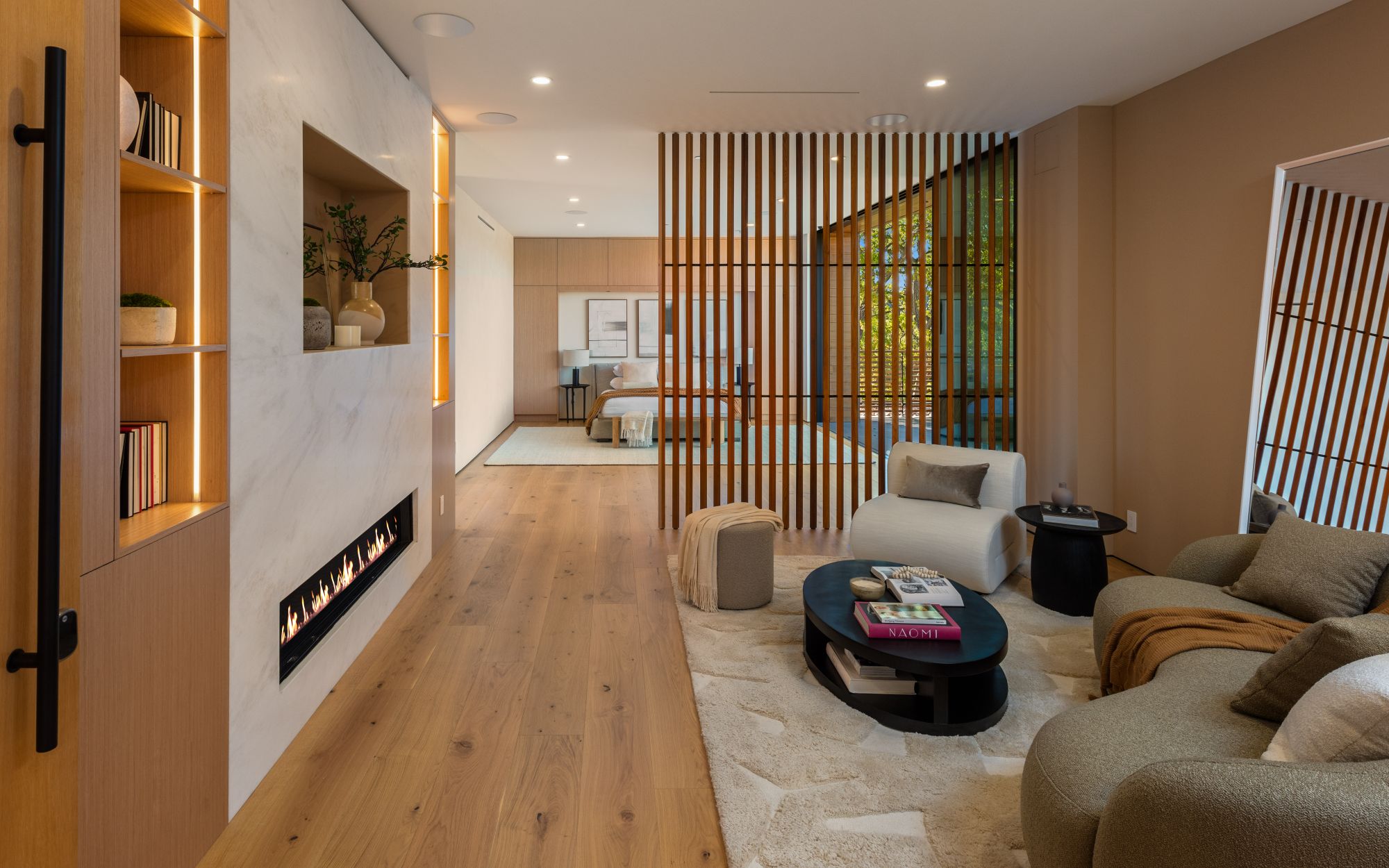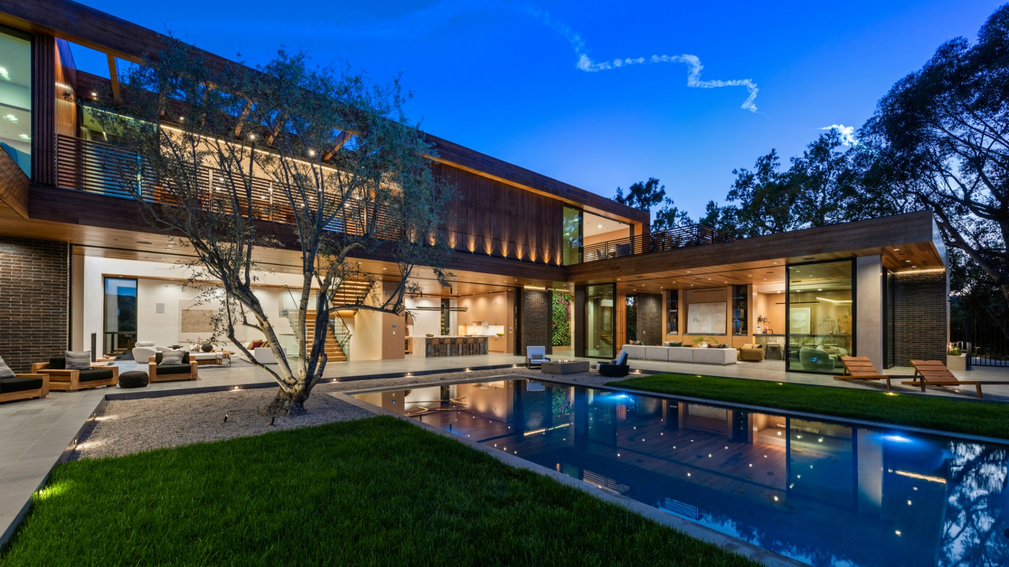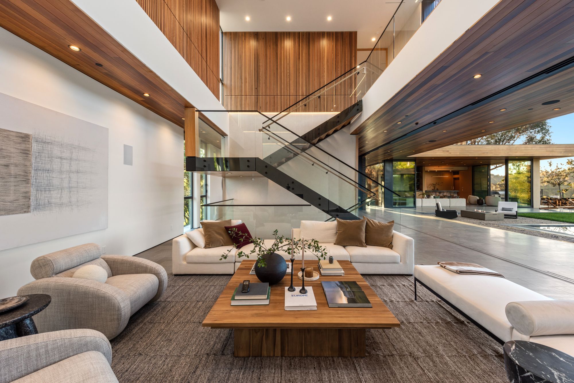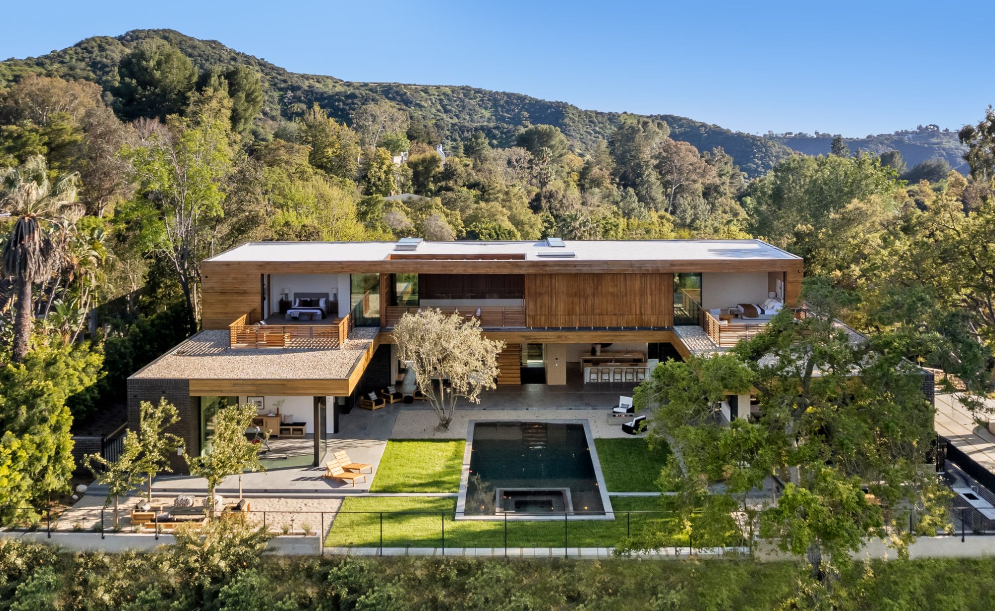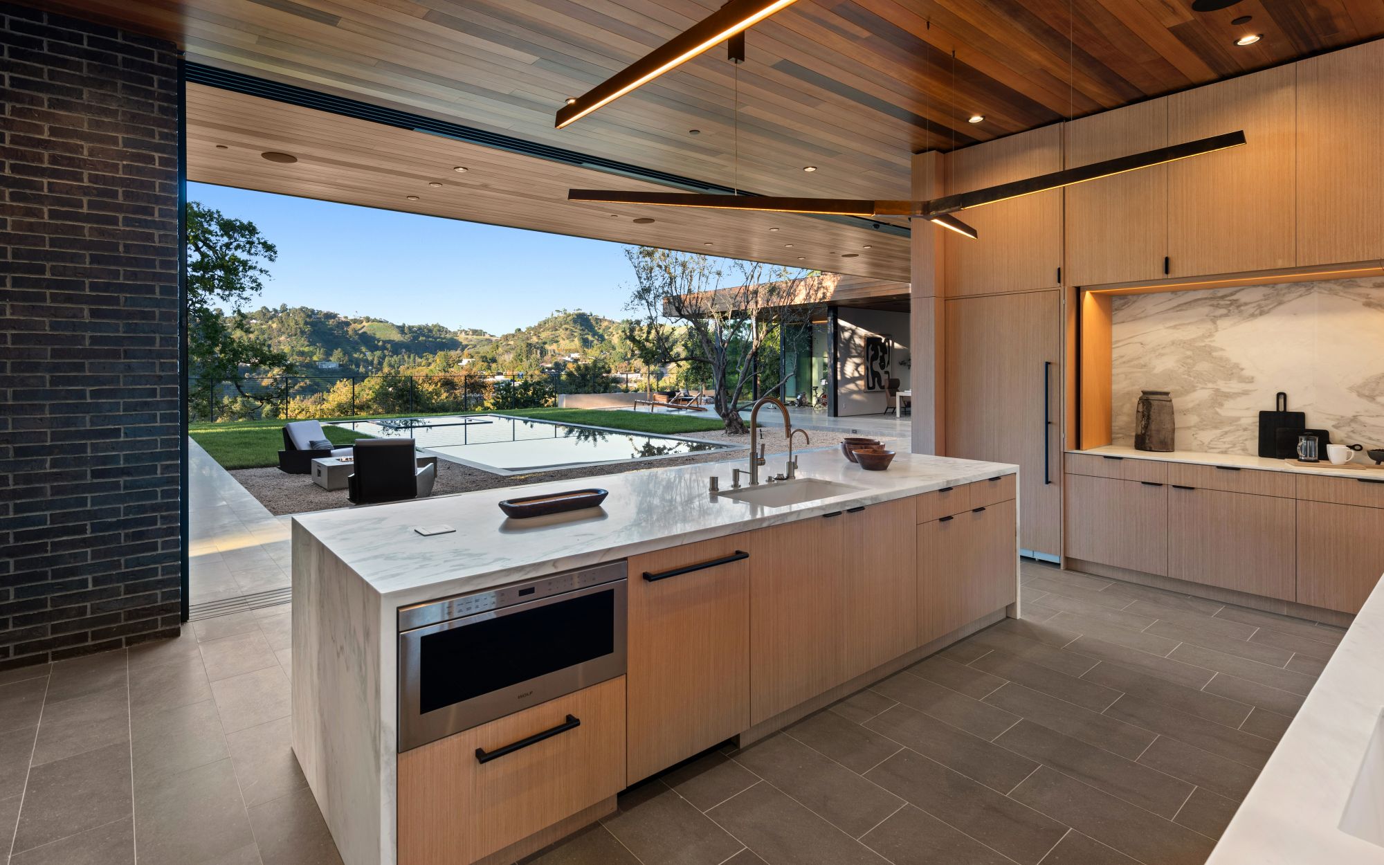 Just completed architectural masterpiece by Noah Walker that exemplifies world-class design and craftsmanship. Set behind the exclusive gates of Oak Pass Road in Beverly Hills, this ultra-private estate is designed for elevated living and grand entertaining. With 6 bedrooms and 9 bathrooms, the home offers ample space for family and guests. An oversized glass door leads to a dramatic foyer featuring a 10-foot greenery wall, brick-clad columns, and hardwood ceilings. A stunning two-story living room with fireplace and 50-foot automatic Fleetwood doors that pocket for seamless indoor/outdoor living. The kitchen boasts dual marble islands, oak cabinetry, Wolf and Subzero appliances, and two Miele coffee makers. The spacious primary suite offers a private sitting area with fireplace, spa-like bathroom, and private balcony overlooking the canyon. Outside, the meticulously landscaped yard offers canyon views, a zero-edge pool and spa, outdoor kitchen, fire pit, olive trees, and multiple lounge areas. The latest and greatest amenities include a movie theater, gym, Himalayan salt sauna, steam showers, wine display, and a Crestron smart home system. This exceptional estate seamlessly blends luxury, privacy, and cutting-edge amenities, offering an unparalleled living experience in Beverly Hills Post Office.