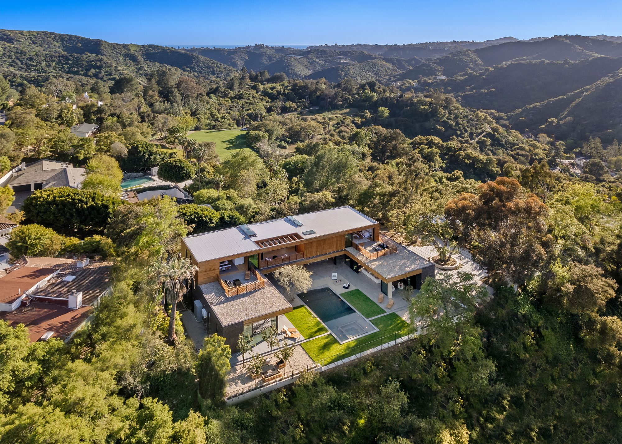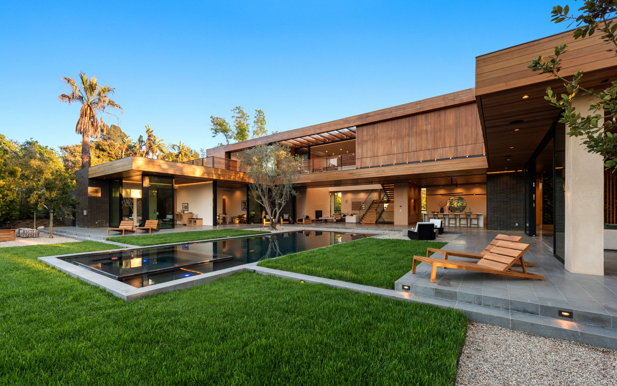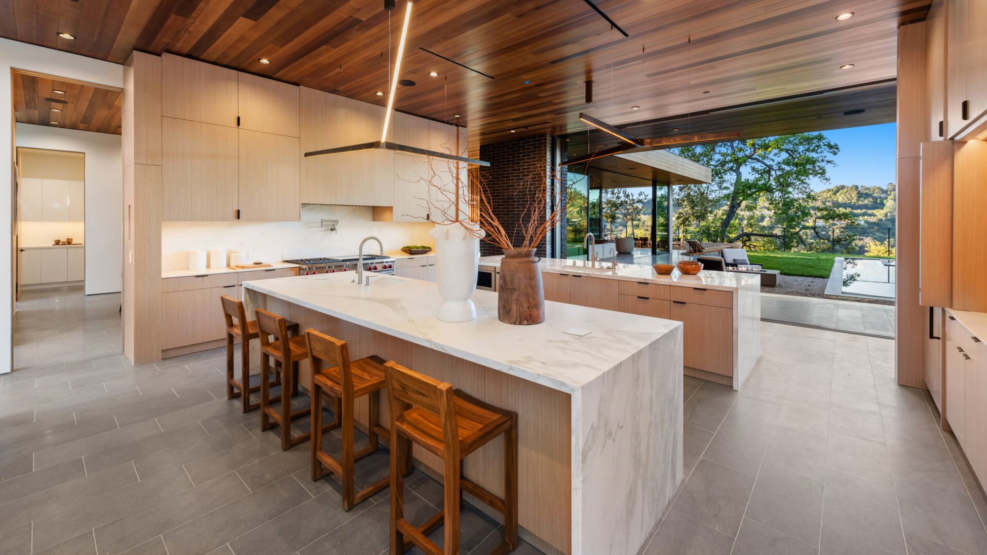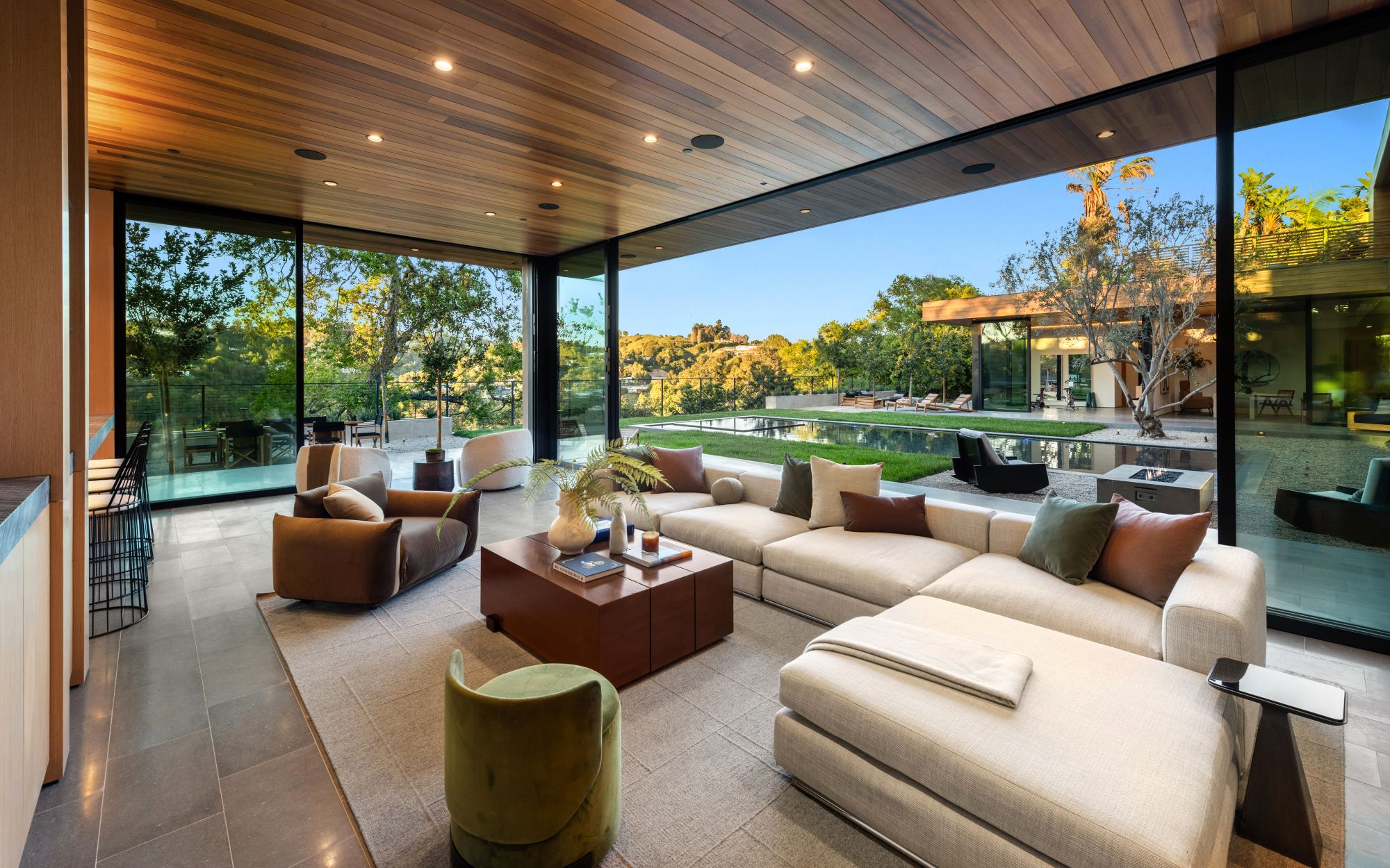 Just completed architectural masterpiece by Noah Walker that exemplifies world-class design and craftsmanship. Set behind the exclusive gates of Oak Pass Road in Beverly Hills, this ultra-private estate is designed for elevated living and grand entertaining. With 6 bedrooms and 9 bathrooms, the home offers ample space for family and guests. An oversized glass door leads to a dramatic foyer featuring a 10-foot greenery wall, brick-clad columns, and hardwood ceilings. A stunning two-story living room with fireplace and 50-foot automatic Fleetwood doors that pocket for seamless indoor/outdoor living. The kitchen boasts dual marble islands, oak cabinetry, Wolf and Subzero appliances, and two Miele coffee makers. The spacious primary suite offers a private sitting area with fireplace, spa-like bathroom, and private balcony overlooking the canyon. Outside, the meticulously landscaped yard offers canyon views, a zero-edge pool and spa, outdoor kitchen, fire pit, olive trees, and multiple lounge areas. The latest and greatest amenities include a movie theater, gym, Himalayan salt sauna, steam showers, wine display, and a Crestron smart home system. This exceptional estate seamlessly blends luxury, privacy, and cutting-edge amenities, offering an unparalleled living experience in Beverly Hills Post Office.